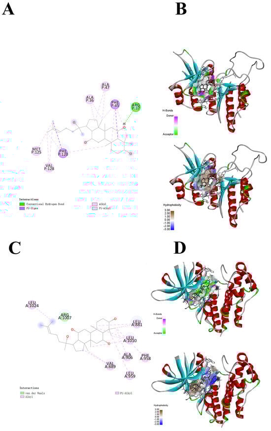 In this study, two proteins with relatively high docking scores were selected for research to investigate the mechanism of action of PPT further. Molecular docking was carried out using Autodock Vina. The docking score of PIKfyve with PPT was −9.4 kcal/mol, and that with JAK1 was −9.3 kcal/mol, both of which were less than −5 kcal/mol, indicating that PPT had binding solid affinity with both of these two proteins. Figure 6A shows the interactions of PPT with multiple amino acid residues of the PIKfyve protein, including ALA36, ALA47, PHE45, ARG37, MET125, PHE120, VAL128, etc. Figure 6B displays the three-dimensional structure of the PIKfyve protein, with PPT embedded inside the binding pocket of PIKfyve and surrounded by the surrounding protein structures. The binding of PPT to PIKfyve involves multiple non-covalent interactions, including hydrogen bonds, π-σ, alkyl, π-alkyl interactions, and hydrophobic interactions. These interactions work together to promote the high complementarity and specific binding of PPT to the binding pocket of PIKfyve.