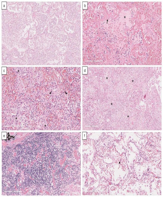 Areas with different phases of DAD were also observed (Figure 1b–d). Due to ARDS, lesions are not usually uniform, but rather there are areas with free alveolar spaces that alternate with others with alveolar collapse. Histologically, DAD is divided into three progressive phases: exudative, proliferative, and advanced fibrotic phases [].
