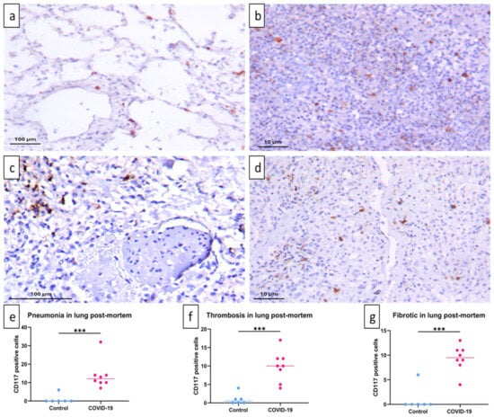To identify MCs in histologically injured lung tissue due to SARS-CoV-2 infection, CD117+ and CPA3+ cells were identified by immunohistochemistry and quantified by automated morphometry. Occasional CD117+ cells were found in the control group’s lungs around blood vessels and airways (Figure 2a). In contrast, in COVID-19-infected lungs (Figure 2b–d), CD117+ cells were significantly more numerous in areas of pneumonia (Figure 2e) and around thrombotic blood vessels (Figure 2f) and were particularly abundant in fibrotic tissue (Figure 2g).