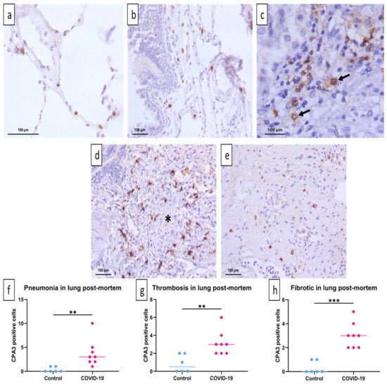 However, CD117+ cells are not only mature MCs and their progenitors but also other hematopoietic progenitor cells recruited from the circulation, as well as innate lymphoid cells []. Therefore, we next quantified CPA3+ cells in post mortem samples from COVID-19 patients and controls. We chose CPA3 because it is a distinctive protease of MCs. Furthermore, in a previous report, we showed that patients with severe COVID-19 had increased serum CPA3 [].