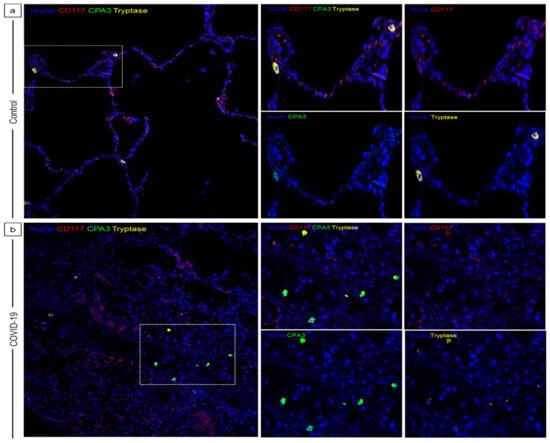 To assess the phenotype of MCs during COVID-19, lung tissue samples from COVID-19 patients and controls were stained by multiplex immunofluorescence for CD117, tryptase, and CPA3. Tryptase and CPA3 are stored in MC granules, which are the main source, and both are considered activation markers. However, some authors have reported their expression in basophils []. Therefore, CD117 was also detected because it is a receptor expressed by mature MCs, which is not found in basophils.