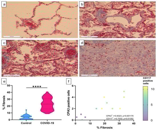 Not least is the increase in CD117+ and CPA3+ cells in the fibrotic areas. Among severe COVID-19 patients who resolve the infection, sequelae due to lung injury may prevail. Epidemiological studies, based on patterns of imaging abnormalities and data from other coronavirus outbreaks, suggest that patients with severe forms of COVID-19 may develop sequelae such as pulmonary fibrosis (PF); this is why the role of inflammation in fibrosis has been described, as well as the participation of immune cells in the release of pro-fibrotic factors [,]. Also, this is associated with idiopathic pulmonary fibrosis (IPF) patients who have increased MCs in their lungs, which correlates positively with the degree of fibrosis and negatively with lung function [,].