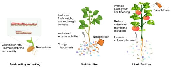 Nanochitosan naturally serves as a source of carbon, oxygen, nitrogen, and phosphorus nutrients for plants. Moreover, nanochitosan as a nanocarrier can also support plant macronutrients (calcium, potassium, nitrogen, sulfur, phosphorus, and magnesium) and micronutrients (manganese, copper, nickel, zinc, boron, iron, and chloride) through its functional groups [34]. The cationic properties of chitosan can be employed to enhance the anion exchange capacity of the soil or growing medium, which is usually much lower than the cation exchange capacity. The leaching of anionic nutrient fertilizers (e.g., nitrates and phosphates) in soils treated with chitosan can be reduced [35].