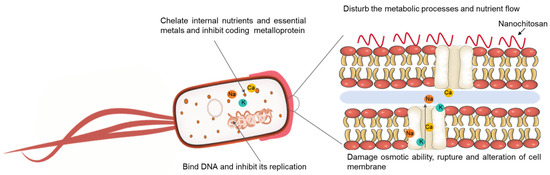 Nanochitosan exhibits a variety of inhibitory effects against bacteria, fungi, and viruses. A nanochitosan polymer has one amino group (-NH2) at the C-2 location and two hydroxyl groups (-OH) at the C-3 and C-6 locations. The -NH2 group imparts a net-positive charge to nanochitosan, allowing it to interact with anionic molecules, including structural and functional anionic protein and cellular membrane phospholipids. It is notable that the C6-OH group has hyperactive -OH groups that can rotate freely with minimal steric hindrance. The -OH functional group acts as an electron acceptor and hastens signal transduction by engaging with cell receptors and accelerating metabolic events. Consequently, nanochitosan has four primary modes of action: (1) The metabolic processes and nutrient flow of the microorganism are disrupted by the formation of a dense polymeric membrane on the pathogen’s surface, resulting from the deposition of chitosan [49]. (2) It interacts electrostatically with the cell membrane, causing increased permeability of the pathogenic organism’s cell envelope, rupture and alteration of the cell membrane, osmotic damage, and eventual death [50]. (3) It forms complexes with certain metal ions, inhibiting the metalloproteins’ activity and microbial growth [51]. (4) It binds to negatively charged phosphate groups in the nucleic acid backbone, thereby inhibiting mRNA transcription and protein translation [52]. This results in the release of LPS from the outer membrane, thereby increasing the permeability of the outer membrane (Figure 3).