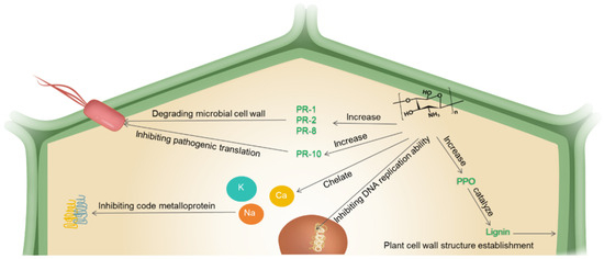 In addition to nanochitosan’s direct effect on pathogenic bacteria, nanochitosan also has an indirect effect on enhancing plant resistance to pathogenic bacteria. Nanochitosan has been demonstrated to effectively induce a host defense response against plant pathogens and generate systemic resistance [53]. Nanochitosan can induce plant defense mechanisms against a variety of plant pathogens, including plant viruses [54]. It can inhibit phage-induced infection through inactivation at the cellular level and the inhibition of propagation [55]. Nanochitosan has also been shown to upregulate the plant gene functions associated with pathogenicity-related genes, such as PR proteins (PR-1 and PR-2 (β-1,3-glucanase), PR-8 (chitinase), and PR-10) and antioxidant genes. The activation of defense genes leads to the accumulation of various enzymes and stress-specific metabolites. (1) In one study, nanochitosan increased the levels and activities of antifungal (PR-1) and hydrolytic enzymes (β-1,3-glucanases (PR-2) and chitinases (PR-8)) to degrade microbial cell walls [56]. (2) Nanochitosan increased the polyphenol oxidase content, which catalyzes the synthesis of lignin from phenolics. This process contributes to the formation of cell wall structures that serve as a barrier to pathogen penetration [57]. (3) Nanochitosan increased ribosome-inactivating protein (PR-10), which releases adenine residues from both ribosomal and non-ribosomal substrates, thereby inhibiting the pathogenic translation [56]. (4) Nanochitosan initiates complex signal transduction pathways involving reactive oxygen species (ROS) production, such as peroxidase, catalase, and superoxide dismutase in the host plant [57].