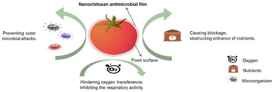 Postharvest decay of agricultural products during transportation and storage causes huge economic losses. Considering the problem of pesticide residues, safer alternatives are needed to control postharvest decay. Nanochitosan has gained considerable acceptance as a dietary supplement and has been approved by the FDA [13]. Nanochitosan is employed as a coating additive for fruits, seeds, and vegetables in edible antibacterial films (Figure 5). The antibacterial bioresorbable materials, composed of poly (lactic acid) and chitosan (4% concentration), have been demonstrated to achieve a sterilization rate of 99% when applied to the BTS [62]. A variety of techniques, including direct casting, coating, extrusion, layer-by-layer assembly, and dipping, can be employed to fabricate nanochitosan-based edible films [63]. It is anticipated that nanochitosan will be utilized in the prevention of postharvest diseases affecting various fruits and vegetable, including cucumbers [64], mushrooms [65], fish, tomatoes, mangos, bananas, and pomegranates [66]. Films based on nanochitosan can be further incorporated with functional substances such as antioxidants, plant extracts, essential oils, and other additives to enhance barrier properties and functionality. Nanochitosan-based edible nanomodifiers are used for functionalizing starch/guar gum biocomposites with superior packaging properties, targeting stringent edible food packaging on fresh cuts. The storage quality in terms of microbial growth, pH change, color attributes, and weight loss is better preserved when it is used as an edible coating on cut apple fruits [67].