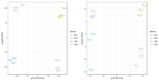 By conducting a principal component analysis (PCA) on the genes and metabolites that respond to low-temperature differences, as shown in Figure 1, it can be seen that the samples are clustered together with minimal dispersion. The 12 samples are then divided into four groups by the principal component PCA1 (31.99%) of differential genes and the principal component PCA1 (50.90%) of differential metabolites. PCA2 clearly separates the two materials, indicating that after low-temperature stress treatment, different materials respond to low-temperature stress with significant differences. The three biological replicates of the same material sample have small differences, indicating high sample reproducibility. The differences between different materials and treatment samples are significant, allowing for subsequent analysis of the results.