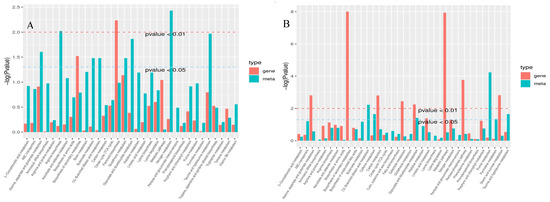 p-value histogram of enrichment analysis of differential gene and differential metabolite. Note: The horizontal axis in the KEGG enrichment diagram represents metabolic pathways, and the red color in the vertical axis represents the enrichment p-value of differential genes, while the green color represents the enrichment p-value of differential metabolites, represented by −log(p-value). The higher the vertical axis, the stronger the enrichment degree. (A) shows the B144 KEGG enrichment diagram, and (B) shows the Q319 KEGG enrichment diagram.