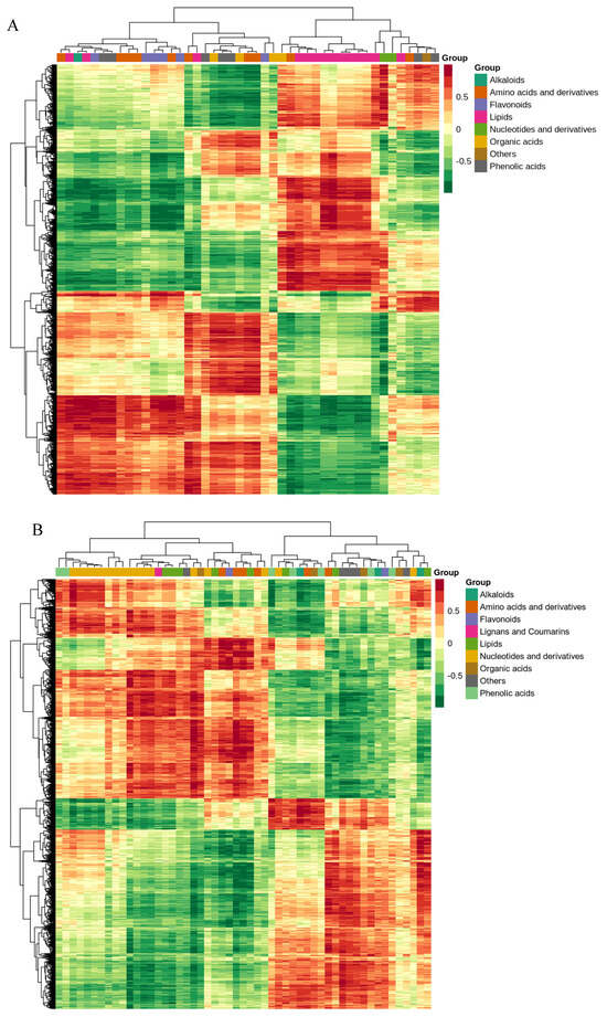 Cluster analysis of differential genes and differential metabolites. Note: (A) shows the differential expression gene and differential metabolite cluster heatmap after B144 low-temperature stress, and (B) shows the differential expression gene and differential metabolite cluster heatmap after Q319 low-temperature stress.