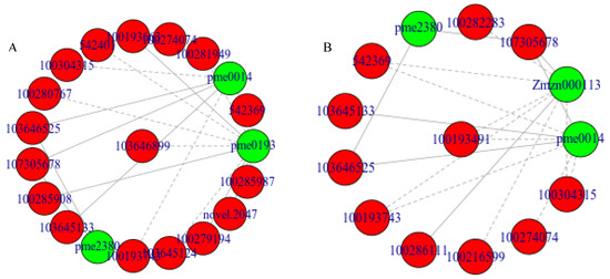 Correlation network analysis of differential genes and differential metabolites. Note: (A) shows the network diagram of differentially expressed genes and differentially metabolized glyoxylate and dicarboxylate metabolism (ko00630) after B144 low-temperature stress. (B) shows the network diagram of differentially expressed genes and metabolized glyoxylate and dicarboxylate metabolism (ko00630) after Q319 low-temperature stress. Metabolites are marked in green, and genes are marked in red. Solid lines represent positive correlation, and dashed lines represent negative correlation.