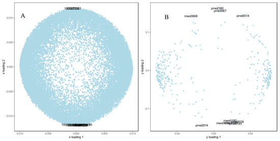 O2PLS model loading graph. Note: (A) represents the transcriptome loading plot, and (B) represents the metabolome loading plot.