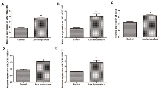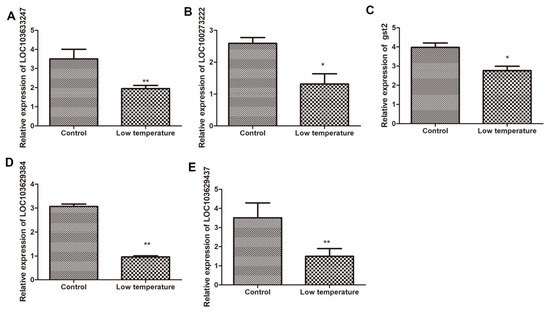 Detection of mRNA expression level of candidate genes in Q319 by qPCR. Note: (A) represents the expression level of LOC103633247; (B) represents the expression level of LOC100273222; (C) represents the expression level of gst2; (D) represents the expression level of LOC103629384; (E) represents the expression level of LOC103629437. * and ** denote levels of significance at p < 0.05 and p < 0.001, respectively.