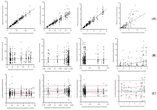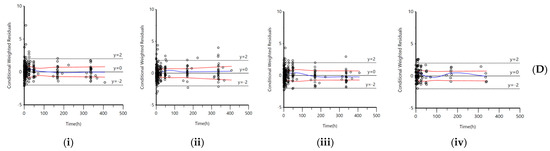 Goodness–of–fit plots, (A) OBS vs. IPRED, (B) OBS vs. PRED, (C) CWRES vs. PRED, and (D) CWRES vs. time for model-predicted (i) 25-hydroxyvitamin D3 (25D3) plasma concentrations, (ii) 1,25-dihydroxyvitamin D3 (1,25D3), (iii) 24,25-dihydroxyvitamin D3, (24,25D3), and (iv) vitamin D3 (VitD3). OBS = observed concentration; IPRED = individual predicted concentration; PRED = population predicted concentration; CWRES = conditional weighted residuals. The black solid line in (A,B) represents the line of unity. The blue solid line in CWRES plot represents trend line for linear regression and red solid line is used to observe the distribution trend of residuals.