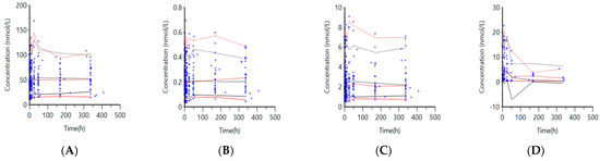 VVPCs for the final model. Observed concentrations (circle) and 5th (solid line), 50th (dashed line), and 95th (dotted line) percentiles from observed (red) and predicted (blue) data for (A) 25-hydroxyvitamin D3 (25D3), (B) 1,25-dihydroxyvitamin D3 (1,25D3), (C) 24,25-dihydroxyvitamin D3 (24,25D3), and (D) vitamin D3 (VitD3).