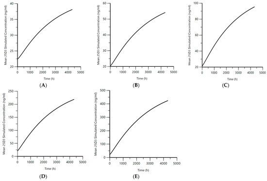 The final population pharmacokinetic model was used to simulate the 25D3 concentrations using clinically applicable cholecalciferol dosing regimens of 600 I.U./day, 1000 I.U./day, 2000 I.U./day, 5000 I.U./day, and 10,000 I.U./day for 6 months. The simulations were conducted based on cholecalciferol dosage regimens used in the clinic and represented a range of low, middle, and high doses. As most of the observed VitD3 data were BLQ, and 25D3 being the major circulating metabolite of VitD3, we focused on a full range of simulated concentrations for 25D3 (Figure 4). The mean 25D3 concentration over time for each dose level was plotted (Figure 4A–E).