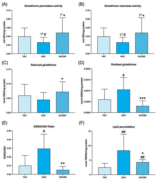 | Glutathione reductase (GR) (mU GR/mg protein) | 0.68 ± 0.30 | 0.47 ± 0.24 T1# | 1.10 ± 0.65 ** # |