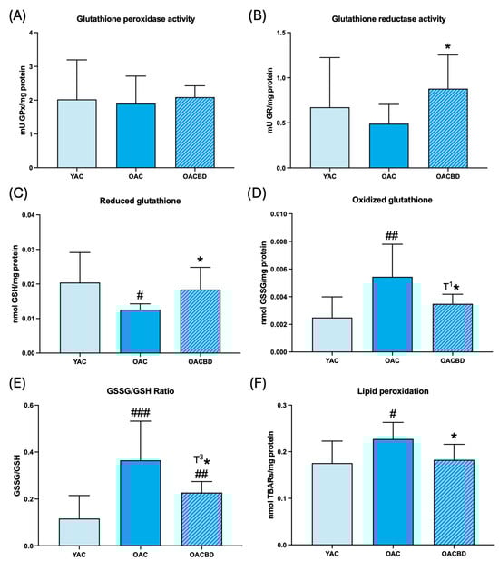 | Oxidized glutathione (GSSG) (nmol GSSG/mg protein) | 84.5 * 10−5 ± 38.7 * 10−5 | 88.7 * 10−5 ± 28.3 * 10−5 | 113 * 10−5 ± 31.3 * 10−5 * # |