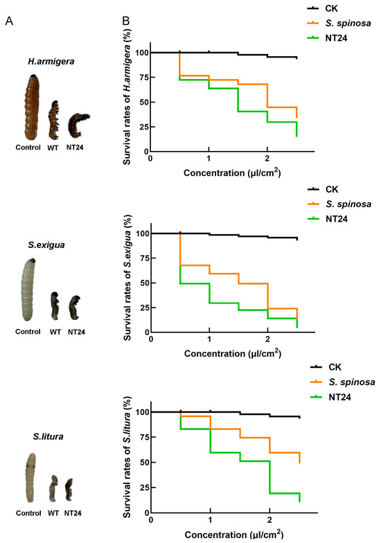 The larvae (KEYUN Biology Technology Inc) of Helicoverpa armigera (H. armigera), Spodoptera exigua (S. exigua) and Spodoptera litura (S. litura) were fed with artificial feed at 28 °C with a light/dark cycle of 12 h. Each well of the 24-well cell culture plates (Corning, USA) was added with 0.25 cm3 (1 cm × 1 cm × 0.25 cm) artificial feed. After the WT and NT24 were fermented for 12 days, the fermentation broth was collected and the artificial feed was sprayed with 0.5, 1, 1.5, 2 and 2.5 (μL/cm2) of fermentation broth, ensuring full coverage of the feed surface. The blank control was the corresponding concentration of normal saline. The larvae were cultured in the 24-well cell culture plates (one larva per well) with three replicates. The survival percentage of the larva was recorded after 48 h.