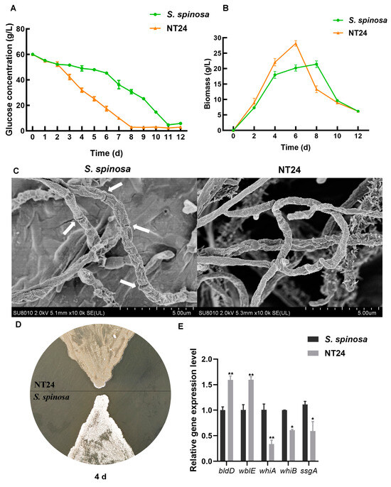 Effects of ARTP/NTG compound mutagenesis on strain growth and development. (A) Glucose consumption curve of WT and NT24. (B) Biomass accumulation curves of WT and NT24. (C) Mycelium comparison of WT and NT24 via SEM. The white arrows point to the differentiation nodes in WT. (D) Sporulation capacity comparison of WT and NT24. (E) Expression levels of genes related to sporulation and mycelium growth. Error bars are calculated from three independent determinations of mRNA abundance in each sample. Univariate variance, * p < 0.05, ** p < 0.005.