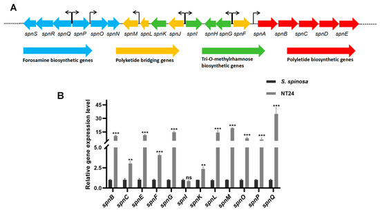Transcription analysis of the spinosad biosynthetic gene cluster analyzed via RT-qPCR. (A) Main structure of the spn gene cluster and the transcription direction of each gene. (B) Transcript levels of representative spn genes. The error bars indicate the standard deviations of three biological replicates. Univariate variance, ns p > 0.05, ** p < 0.005, *** p < 0.001.