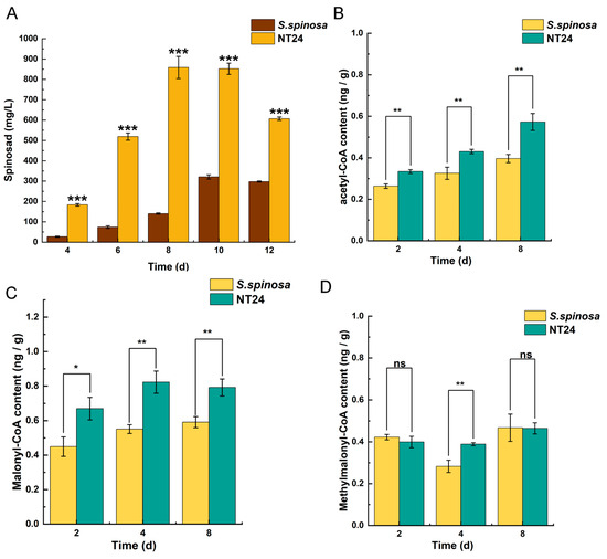 Effects of ARTP/NTG compound mutagenesis on the accumulation of spinosad and acyl-coA pool. (A) Spinosad accumulation of WT and NT24. (B) Acetyl-CoA accumulation of WT and NT24. (C) Malonyl-CoA accumulation of WT and NT24. (D) Methylmalonyl-CoA accumulation of WT and NT24. Univariate variance, ns p > 0.05, * p < 0.05, ** p < 0.005, *** p < 0.001.