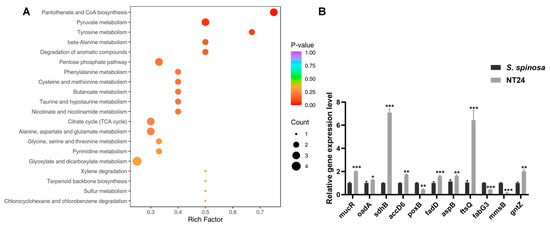 Representative differential genes and KEGG enrichment pathways in NT24. (A) Bubble plot of the most significant pathways with KEGG enrichment of DEGs. (B) Transcription levels of differential genes in NT24. Univariate variance, * p < 0.05, ** p < 0.005, *** p < 0.001.