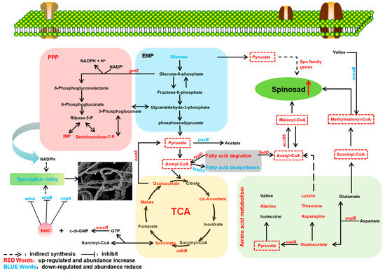 The results of spinosad accumulation show that the fermentation cycle of NT24 was shortened by two days, reaching the highest titer of 858.3 ± 27.7 mg/L on the 8th day, which is consistent with the growth trend. The glucose consumption assay showed an accelerated rate of glucose consumption in NT24, which may be related to the previously mentioned acceleration of cell division. Accelerated cell division resulted in more cells in a short period, thus consuming more glucose. In addition, the RT-qPCR results show that the 6-phosphogluconate dehydrogenase (an important enzyme in the pentose phosphate pathway, PPP) coding gene gntZ was significantly upregulated in NT24, which catalyzes the generation of ribulose from glucose-6-phosphate. Ribulose can further be converted into sedoheptulose-7-phosphate or IMP. Targeted metabolomics also confirmed significantly increased levels of sedoheptulose-7-phosphate and IMP, suggesting that the upregulation of gntZ led to an increase in PPP pathway flux. Meanwhile, PPP is an important source of NADPH, and according to recent analyses of biological intracellular metabolite levels, the balance between NADH production and NADPH consumption by redox metabolism affects the biosynthesis and morphological differentiation of secondary metabolites [49,50].