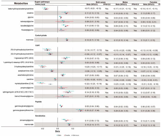 ALM-related metabolites from MR with robust colocalization evidence. Light blue represents males, red represents females, and black represents the overall population. The dots indicate the effect sizes of the corresponding metabolites, with horizontal lines showing the corresponding 95% confidence intervals (CIs). Solid dots indicate evidence supported by colocalization, while hollow dots indicate a lack of colocalization evidence.