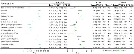WBLM-related metabolites from MR with robust colocalization evidence. Light blue represents the overall population, light purple represents males, and green represents females. Squares indicate the effect sizes of the corresponding metabolites, with horizontal lines representing 95% confidence intervals (CIs).