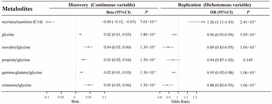HGS-related metabolites from MR with robust colocalization evidence and results of replication analysis. Squares indicate the effect sizes of the corresponding metabolites, with horizontal lines representing the 95% confidence intervals (CIs).