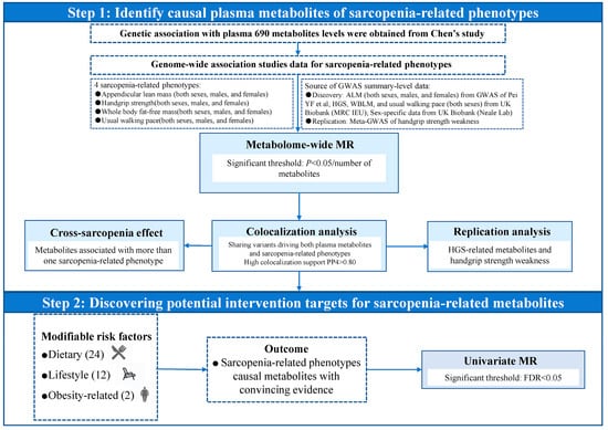 - Chen, S.; Dong, Y.; Aiheti, N.; Wang, J.; Yan, S.; Kuribanjiang, K.; Li, H.; Peng, X.; Wupuer, A.; Li, Y.; et al. Metabolome-Wide Mendelian Randomization Assessing the Causal Relationship Between Blood Metabolites and Sarcopenia-Related Traits. J. Gerontol. Ser. A Biol. Sci. Med. Sci. 2024, 79, glae051. [Google Scholar] [CrossRef]