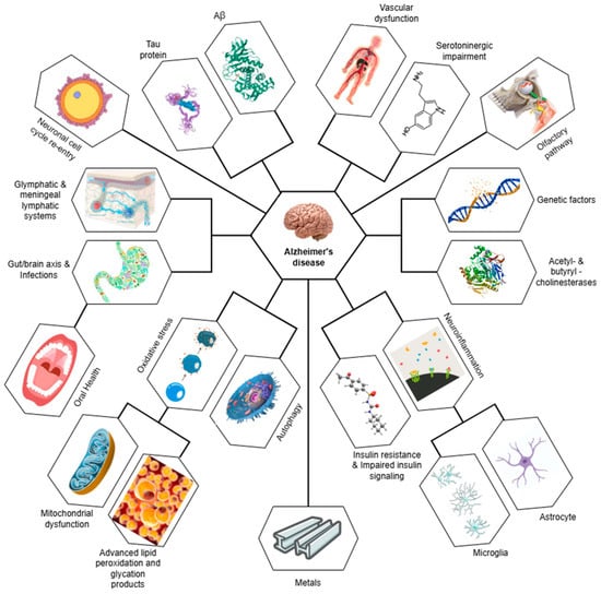 Meanwhile, several other mechanisms are currently being explored, including the glymphatic and lymphatic pathways, alterations in the microbiota and the gut–brain axis, serotoninergic impairments, autophagy alterations, vascular dysfunction, olfactory pathway, oral health, and the metal hypothesis, particularly involving calcium and iron [,,,,]. The involvement of genes in AD pathogenesis is also widely studied, with recent extensive genomic analyses revealing more than 40 genetic risk factors that have been implicated in various neuropathological processes [].