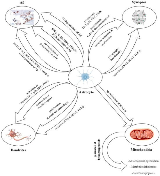 On the other hand, decreased glutamate transport and signaling, together with disrupted Ca2+ signaling and the reduced expression of thrombospondin-1, collectively create a synaptotoxic environment that indirectly reduces synaptic density []. Through the activation of various mediators, such as caspases 1 and 3, p38, and protein kinase C (PKC), as well as pathways such as phosphoinositide 3-kinases, astrocytes can cause neuronal damage, the destruction of dendritic spines, and synaptic dysfunction, which ultimately results in cognitive impairment []. Contradictory, astrocytes facilitate dendritic appendage proliferation and enhance synaptic functionality through the secretion of neurotrophic factors, including the Neuron Growth Factor (NGF), brain-derived neurotrophic factor (BDNF), and Tumor Beta Growth Factor (TGF-β) []. Another mechanism by which astrocytes are involved in the development of AD involves the up-regulation of monoamine oxidase B (MAO-B) in these cells, culminating in an increased generation of hydrogen peroxide. This can potentially lead to neuronal harm and apoptosis, mitochondrial dysfunction, and metabolic deficiencies [].