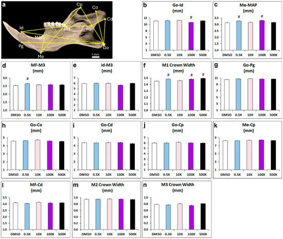Morphometric analysis of distance measurements in mandibles from adult mice prenatally exposed to 0.5×, 10×, 100× and 500× of Mixture N1 or the vehicle (DMSO). Quantification of the measurements. Data represent estimated marginal means ± SEM. Generalized linear models (GLMs) were performed for statistical analysis followed by Bonferroni post hoc tests when appropriate. (a) Landmarks used in micro-CT analysis. (b) Distance from Go to Id was affected by the treatment (W4 = 26.548; p < 0.001) and was decreased in the 100× group vs. DMSO. (c) Distance from Me to MAP was affected by the treatment (W4 = 27.826; p < 0.001) and was increased in the groups 0.5× and 100×, compared to DMSO. (d) The distance from M3 molar to MF was affected by the treatment (W4 = 20.497; p < 0.001) and was increased in the 0.5× group. (e) The distance from M3 to Id was not significantly changed. (f) The Μ1 crown width was affected by the treatment (W4 = 66.279; p < 0.001) and was increased in the 0.5×, 100× and 500× groups. No significant effects were observed in the distances from Go to Pg (g), Go to Co (h), Go to Cd (i), Go to Cp (j), Me to Cp (k), MF to Cd (l), and in the crown width of molars M2 (m) and M3 (n). Go: gonion; Id: infradental; Me: menton; MAP: mandibular alveolar point; MF: mandibular foramen; Pg: pogonion; Co: dorsal condylar process; Cd: ventral condylar process; Cp: coronoid process; M: molar. # Statistically significant vs. DMSO group.