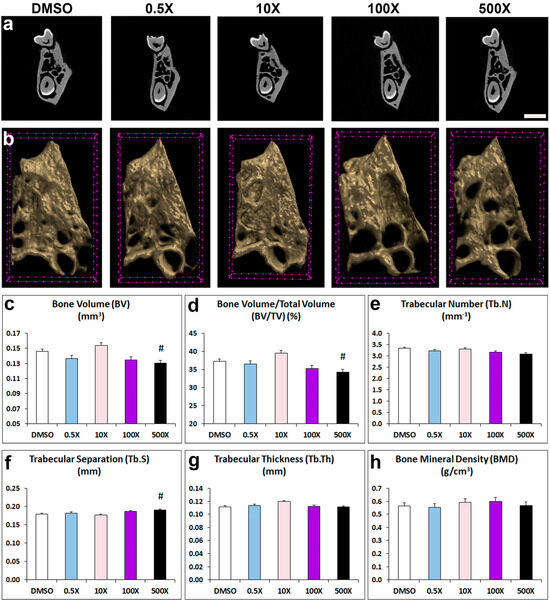 Representative 2D (a) and 3D (b) micro-CT images of trabecular alveolar bone from adult mice prenatally exposed to DMSO, 0.5×, 10×, 100× and 500× of Mixture N1. (c–h) Quantification of the measurements. Data represent estimated marginal means ± SEM. Generalized linear models (GLMs) were performed for statistical analysis followed by Bonferroni post hoc tests when appropriate. (c) BV was affected by the treatment (W4 = 27.966, p < 0.001) and was decreased in 500× vs. DMSO. (d) BV/TV was affected by the treatment (W4 = 29.316 p < 0.001) and was decreased in 500× vs. DMSO. (f) Tb.S was affected by the treatment (W4 = 18.371, p = 0.001) and was increased in 500× vs. DMSO. Trabecular number (Tb.N), (e), thickness (Tb.Th) (g) and bone mineral density (BMD) (h) did not differ significantly from DMSO group. # Statistically significant vs. DMSO group. Scale bars: 2a = 1 mm; 2b = 100 μm.