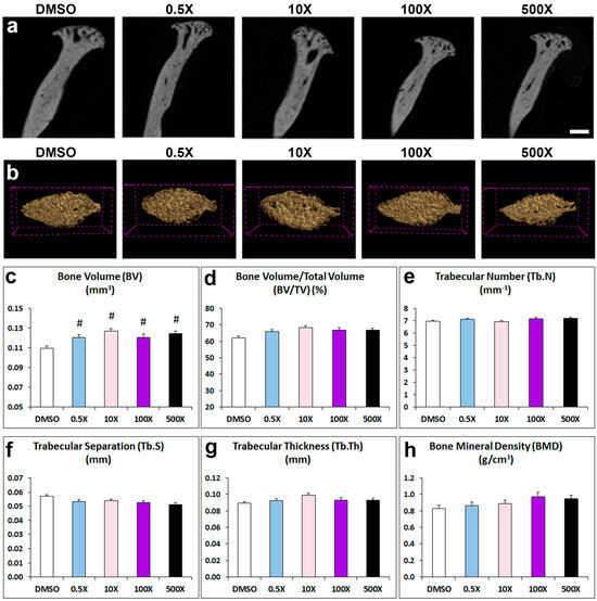 The micro-CT analysis of the cancellous bone in the condylar head showed a significant increase in the BV in all experimental groups treated with Mixture N1 compared to the DMSO group (Figure 3c). However, other important condylar bone parameters such as BV/TV, Tb.N, Tb.S, Tb.Th and BMD were not significantly affected by prenatal treatment with Mixture N1 (Figure 3d–h and Table S2).