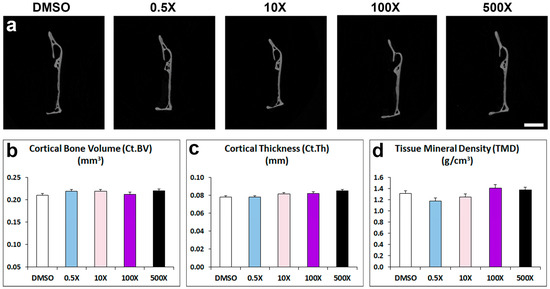 (a) Representative micro-CT images of cortical bone of the mandible from adult mice prenatally exposed to DMSO, 0.5×, 10×, 100× and 500× of Mixture N1. Quantification of the measurements for Ct.BV (b), Ct.Th (c) and TMD (d). Data represent estimated marginal means ± SEM. Generalized linear models (GLMs) were performed for statistical analysis. Scale bar: 1 mm.