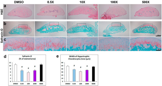 The basic histology of the condylar head was examined in 4 μm paraffin sections (Leica RM 2125 microtome, Leica Microsystems, Wetzlar, Germany) stained with Hematoxylin and Eosin (H&E). Safranin-O/Methylene green staining was used to locate the zone of hypertrophic chondrocytes in the condylar head. Digital images of stained sections, corresponding to the mid-coronal part of the condylar head, were obtained by optical Microscope (Eclipse E400, Nikon, Tokyo, Japan) and the stained areas were quantified as % of the total condylar head area using ImageJ Software (v. 1.54f, 2023, NIH Image, National Institutes of Health, Bethesda, MD, USA) by two independent observers blindly. Animal samples used in quantification of staining: DMSO: n = 6; 0.5×: n = 5; 10×: n = 4; 100×: n = 6; 500×: n = 4. For each sample, an average of 3–5 sections was used in the analysis. In addition, the area width of hypertrophic chondrocytes was measured in the same samples based on the morphology of these cells. Specifically, for each available section from each animal/group, we performed 8–12 (usually 10) vertical measurements in the hypertrophic chondrocytes’ area, in most cases following the palisades formed by the hypertrophic chondrocytes. We used a systematic-random sampling method starting at a random point at the left end of the zone and measuring every 50 μm (lateral step), to cover the whole length of the zone.