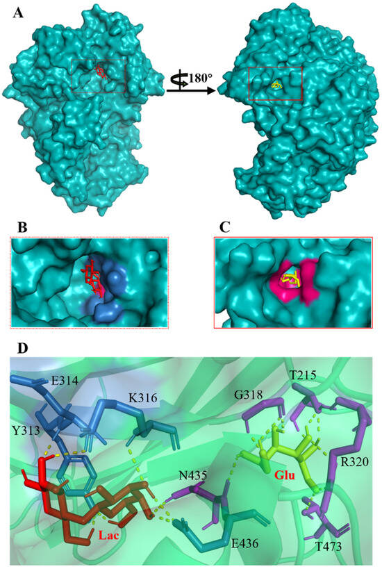 Detailed binding interactions of lactose and glucose with β-galactosidase BglD. (A) Comparative overview of BglD’s structure with bound lactose (left) and glucose (right). (B) Enlarged view of the lactose-binding site. The red stick was the lactose molecule and the blue part was the amino acid residues docked with lactose. (C) Enlarged view of the glucose-binding site. The yellow stick was the glucose molecule and the magenta part was the amino acid residues docked with glucose. (D) Close-up on the microenvironment facilitating the binding of lactose and glucose. The amino acid residues involved in binding lactose included Y313, E314, K316, N435, and E436, while glucose binding involved T215, G318, R320, N435, and T473. Notably, N435 was a shared residue in the binding sites of both sugars.