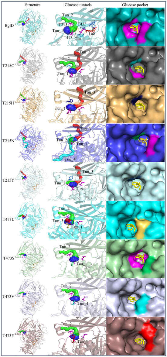 In pursuit of understanding the molecular underpinnings responsible for the amplified catalytic activity and efficiency, we examined the three-dimensional configurations of the T215 and T473 mutants utilizing a BglD crystal structure as a reference template and delineated the glucose release pathways with the aid of CAVER Web v1.2. Within the BglD structure, we identified two tunnel-like features, designated as tun_1 and tun_2, which exhibited substantial congruence (Figure 3). Subsequent molecular docking analyses revealed that the amino acid residue T435 served as a pivotal junction for the binding of glucose and lactose molecules, with the glucose moiety partially penetrating tun_2 (Figure 3). It was postulated that the glucose generated via the catalytic process traversed through residue T435, culminating in its egress through tunnels tun_1 and tun_2. Notably, alterations in the mutants manifested as transformed configurations and localizations of the glucose conduits in comparison to the BglD counterpart. Specifically, the entrance of tun_1 in the mutants penetrated deeper into the enzyme’s structure, facilitating the insertion of glucose into this channel (Figure 3). This structural modification likely contributes to the expedited release of glucose in the mutant enzymes [18,23,24].