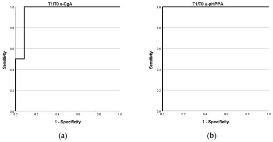 (a) T1/T0 serum chromogranin A (s-CGA) ROC curve; (b) T1/T0 urinary para-hydroxyphenylacetic acid (u-pHPPA) ROC curve.