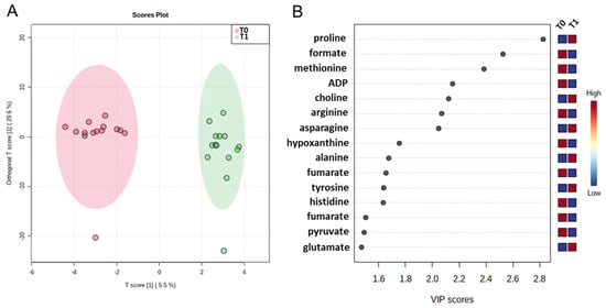 Score plot (A) and Variable Importance Plot (VIP) (B) related to metabolomic profiling on plasma samples at baseline (T0) and after one year of follow-up (T1). In the score plot, the red and green circles indicate the metabolome evaluated for each of the fourteen patients at T0 and T1 time. In the VIP plot, the colored boxes on the right from blue to red indicate low and high levels of the metabolites in each group under study (T0 and T1), respectively. Higher VIP scores indicate more difference between the metabolite levels at two times.