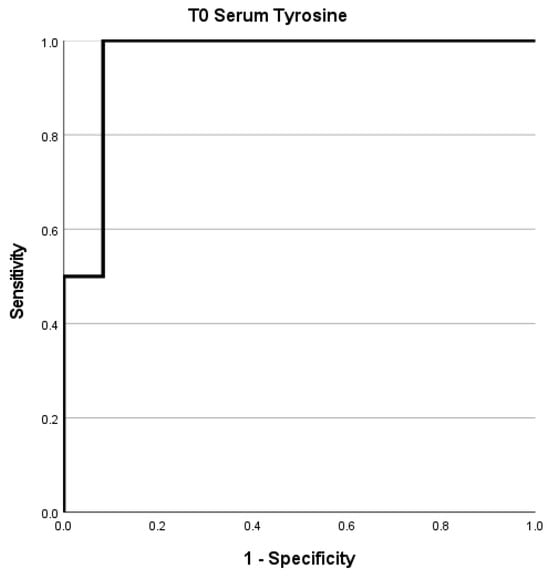 To determine the optimal cutoff value for serum tyrosine, we performed an ROC curve analysis. We found that tyrosine exhibited a very good performance (AUC = 0.958; Sensitivity: 100%; Specificity: 83%) with a cut-off of 0.204 (Figure 3). Kaplan–Meier analysis was then performed for the T0 tyrosine cut-off derived from the ROC curves, with a significant Log-rank test result (p = 0.007) (Supplementary Figure S4).