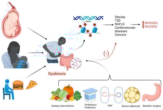The gut microbiota is shaped from gestation and birth (via mother-to-infant transmission), through early childhood (influenced by diet), and into adulthood (affected by diet and lifestyle). This process could lead to dysbiosis, particularly with high-calorie, fat-rich diets and sedentary behavior. In the case of dysbiosis, the gut microbiota can influence host gene expression and trigger various epigenetic changes, contributing to obesity and related comorbidities and increasing morbidity and mortality. However, dietary and non-dietary interventions can help restore a balanced microbiota, reducing the risk of obesity-related comorbidities. Created with BioRender.com (accessed on 7 September 2024).