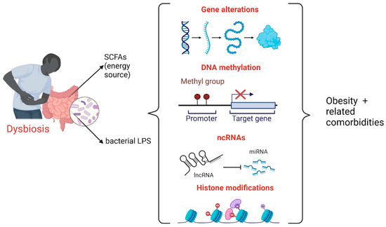 In cases of dysbiosis, the levels of metabolites such as SCFAs and translocated bacterial lipopolysaccharides increase, leading to genetic alterations and epigenetic modifications (including DNA methylation, ncRNAs, and histone changes), which heighten the risk of obesity and its related comorbidities. Created with BioRender.com (accessed on 8 September 2024).