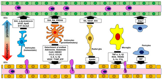 Radial glial cells (RGs), which are considered the main source of astrocyte progenitor cells, were reported to interact extensively with vascular endothelial cells [74]. RGs express retinoic acid (RA) and vascular endothelial growth factor (VEGF), which interact with RA receptors and VEGF receptor 2 on endothelial cells, respectively [52,53,54,75]. Furthermore, the removal of RGs reduced vascular density and branching, and the mechanism for this might involve the stabilization of vessels by inhibiting Wnt signaling, which controls the expression of matrix metalloproteinase (MMP) involved in BM destruction [76]. In addition to astrocytes, RG have also been shown to express Shh [55]. Furthermore, RGs express Ephrin A4 (EphA4) [56], which promotes vascular endothelial cell dysfunction [57,77] (Table 1, Figure 1).