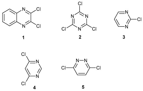 Sequential nucleophilic aromatic substitution reactions of activated halogens [,] and nitro groups [] are useful for building new functionalized ring systems, particularly phenoxazines, phenothiazines, phenoxothiazines and diastereoisomers from them []. Heterocyclic ring systems are important as building blocks for new pharmaceuticals and general methods for their synthesis are useful [,,]. They also provide model analogues for crystalline forms of pharmaceutical ingredients []. A wide spectrum of building blocks with activated chlorine atoms are known, which can be made or purchased. These include 2,3-dichloroquinoxaline 1 [,,,], trichlorotriazine 2 [], 2-chloropyrimidine 3 [,,], 4,6-dichloropyrimidine 4 [,] and 3,6-dichloropyridazine 5 [,,] (Figure 1).