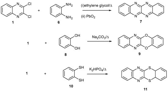 Tetraazaacene 7 was made by reacting 2,3-dichloroquinoxaline 1 with ortho-phenylenediamine 6 followed by oxidation with PbO2 []. Compound 9 was made by reacting 2,3-dichloroquinoxaline 1 with catechol 8 [,] and compound 11 was prepared by reaction with benzene-1,2-dithiol [] (Figure 2).