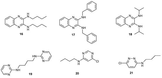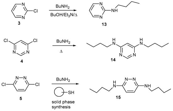 Figure 4 shows some further reactions of 2-chloropyrimidine 3, 4,6-dichloropyrimidine 4 and 3,6-dichloropyrimidine 5 with butylamine. The products 13 [], 14 [,] and 15 [] are relatively easy to form. The butylamino group has been of interest to us for some time because the alkyl chain is short enough to usually be ordered in the solid state, whereas longer chains frequently lead to disorder in crystal structures []. The butyl chain is also long enough to reduce the polarity of the product making it easier to isolate. We have found that polar compounds are harder to isolate and purify: in some cases, we prepared compounds using a butylamino side chain, but with propyl, ethyl or methylamino side groups, no products could be isolated.