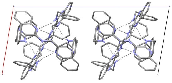 In the extended structure of compound 16, helical hydrogen-bonded chains occur, with the quinoline N1 atom acting as a double acceptor for both N–H groups of an adjacent molecule in what we call a ‘pincer’ motif. The crystallographic symmetry of the column is a 41 screw axis (Figure 8 and Figure 9). Due to inversion symmetry, the columns propagate both ‘up’ and ‘down’ the c axis direction.